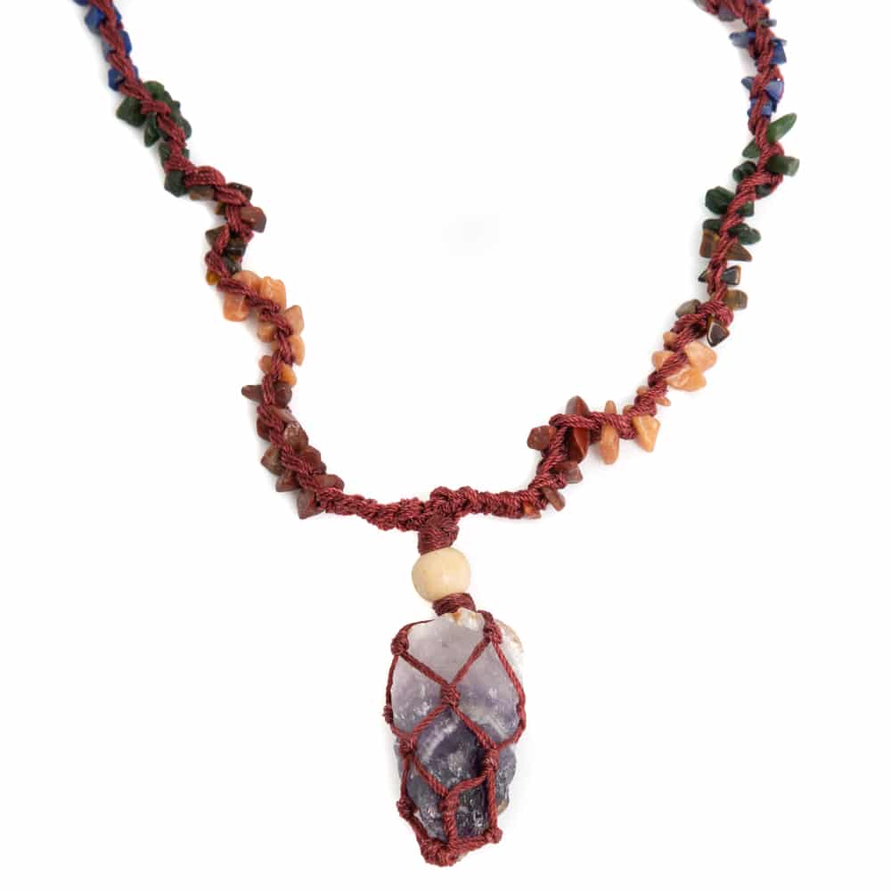 Een hanger met een ruwe amethist edelsteen aan een koord met Chakra Edelstenen. De hanger is ongeveer 4 cm groot. De amethist is een natuurlijke ruwe steen en elke hanger verschilt in kleur en vorm van elkaar. Amethist komt voor van licht tot donkerpaars. De ketting is verstelbaar van ongeveer 40 tot 80 cm in omtrek.
