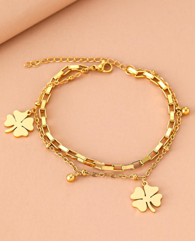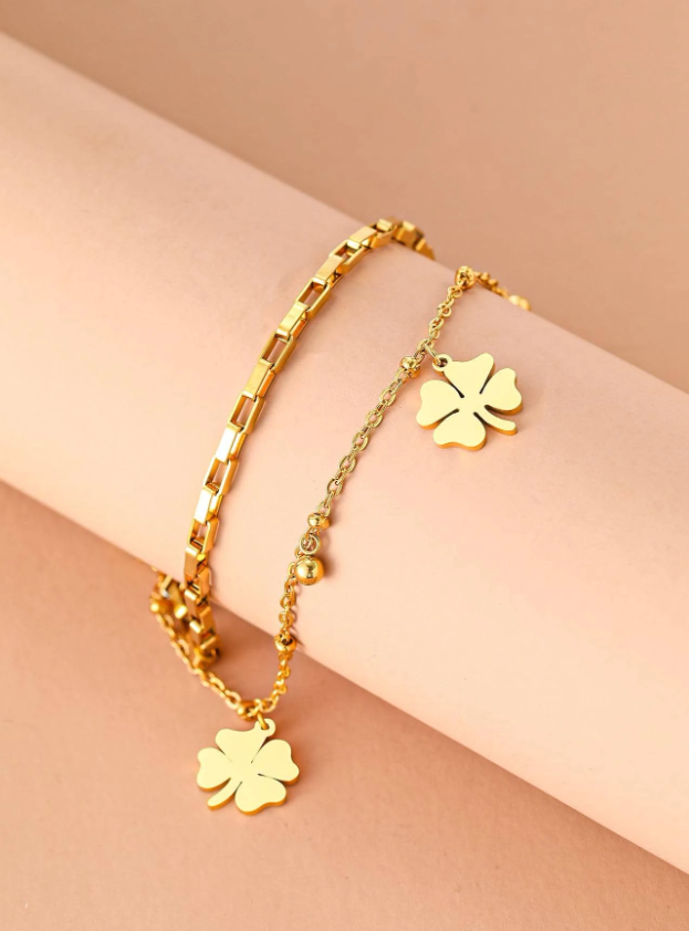 Mooie armband van Roestvrij staal met een 14k plating laagje. De armband bestaat uit een wat fijner en een grovere schakel. Bedeltjes van een klaver. De armbanden bevatten een karabijn slotje en een verlengketting van ongeveer 5 cm. Leuk om te combineren met onze andere sieraden.