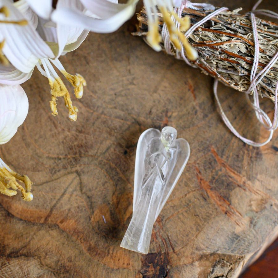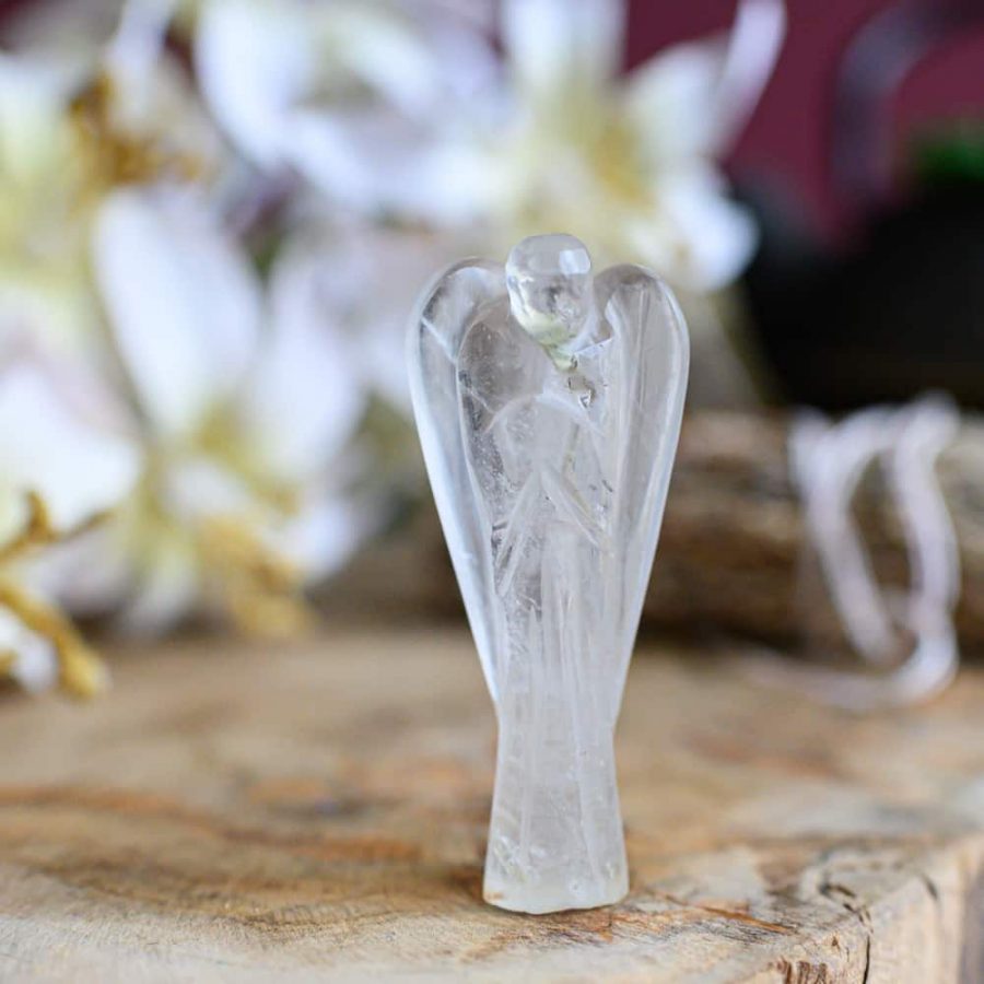 Staande engel van +- 50 mm van goeie kwaliteit Bergkristal. Bergkristal zou een sterk genezende steen zijn die helpt tegen allerlei kwalen. Ook staat deze steen erom bekend dat het de werking van andere stenen versterkt. Kenners geloven dat de steen zuiverend werkt en de aura beschermt tegen straling. Ook zou Bergkristal de chakra’s kunnen reinigen en in balans kunnen brengen en de energiestroom reguleren en vitaliteit geven.