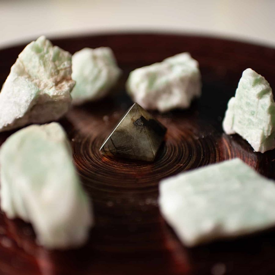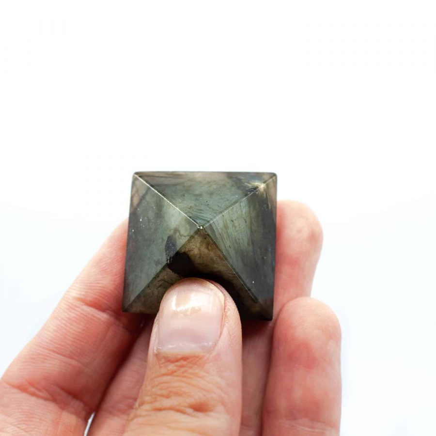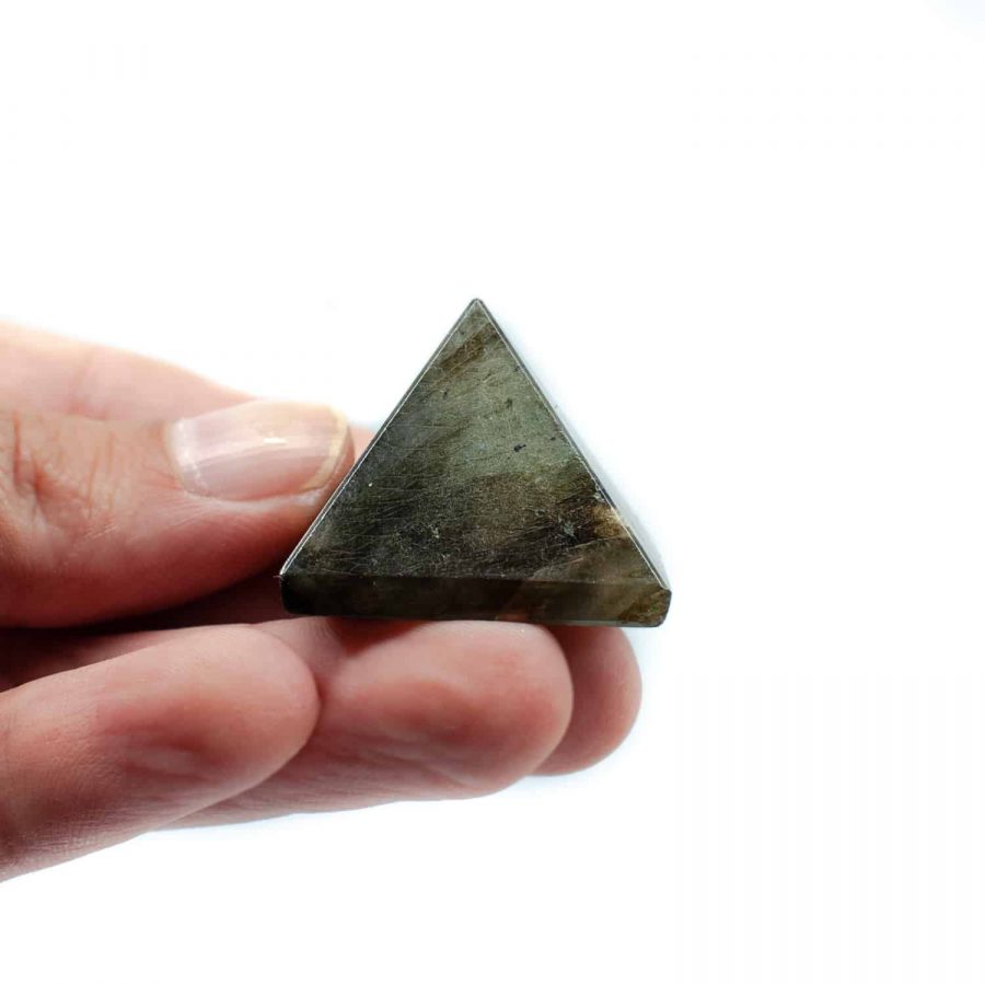 Edelsteen piramide van ongeveer 25 x 25 mm in Labradoriet. Labradoriet staat voor zelfreflectie, waarheid en intuïtie. Men zegt dat de steen een beschermende werking heeft en daarnaast spiritualiteit bevordert.