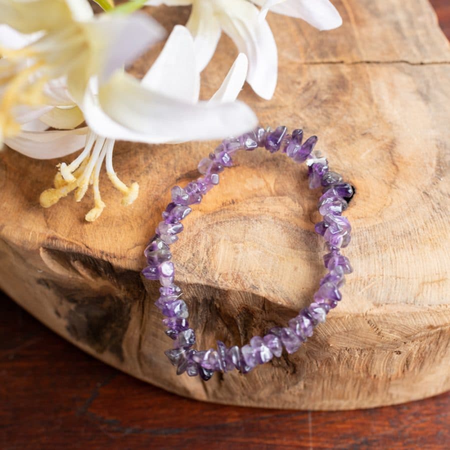 Splitarmband Amethist met splitstenen van ca. 5 tot 10 mm. Amethist is een purperkleurig kwartskristal. Kleuren variëren van licht lavendel tot diep violet. Amethist kristallen staan bekend om spirituele eigenschappen en ze kunnen worden gebruikt ter ondersteuning van het verhogen van je bewustzijnsniveau. Men zegt dat ze een brug vormen tussen aardse en etherische werelden, waardoor er een opening komt naar spiritueel bewustzijn.