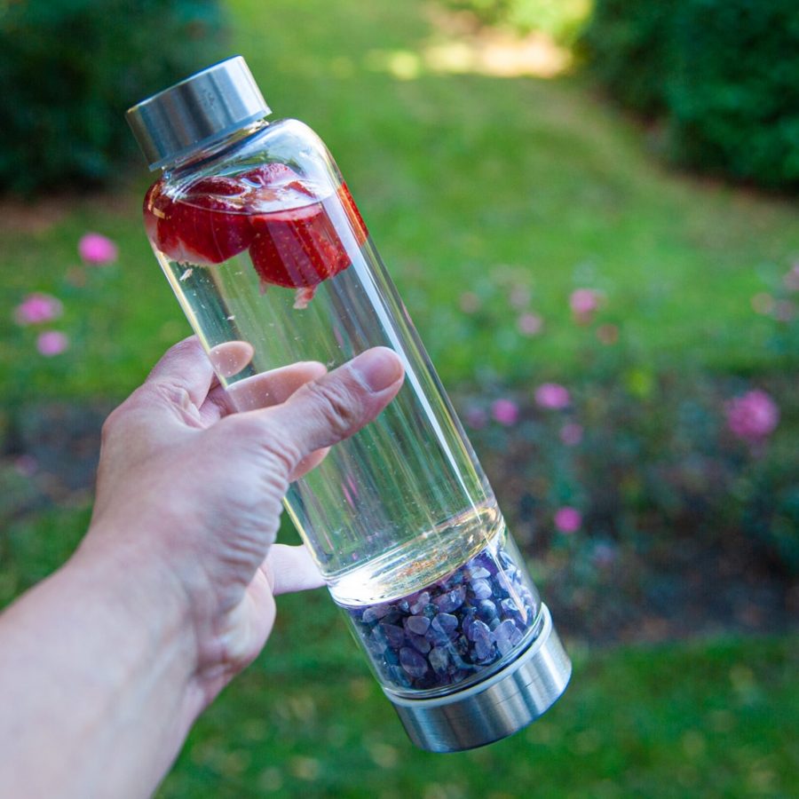 Een prachtige robuuste drinkfles met de edelsteen Roze Kwarts. De fles is gemaakt van dik glas en kan daarom goed tegen een stootje. Het is de ideale fles om mee te nemen naar een yoga-, meditatie- of groepsles. De dop sluit goed zodat het niet gaat lekken. Het voordeel van het glas is dat het water langer lekker blijft dan in bijvoorbeeld een plastic flesje. De inhoud van de fles is ongeveer 400 ml. Door de afmetingen van 23cm x 6,7cm is de fles makkelijk bij je te dragen. Het onderste gedeelte kan je van de fles draaien. Hierdoor kan...