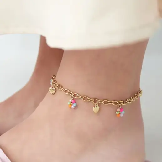 Heel mooi enkelbandje gemaakt van roestvrij staal met een 14k gouden laagje plating. Aan het enkelbandje hangen bedels ook gemaakt van roestvrij staal en hoogwaardige materialen zoals natuursteen en zoetwater parels. Het materiaal verkleurd niet en is waterproof waardoor er ook met het enkelbandje gedoucht en gezwommen kan worden. Het enkelbandje bevat een verlengkettinkje van 5 centimeter waardoor het in maat versteld kan worden. Kijk ook voor onze bijpassende armbandjes.