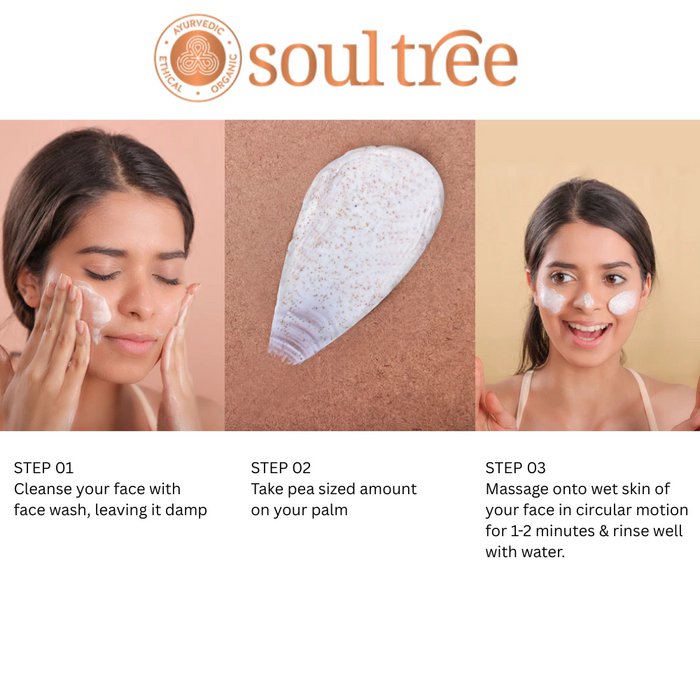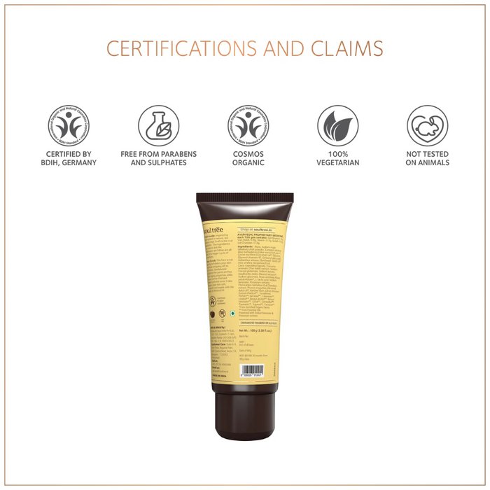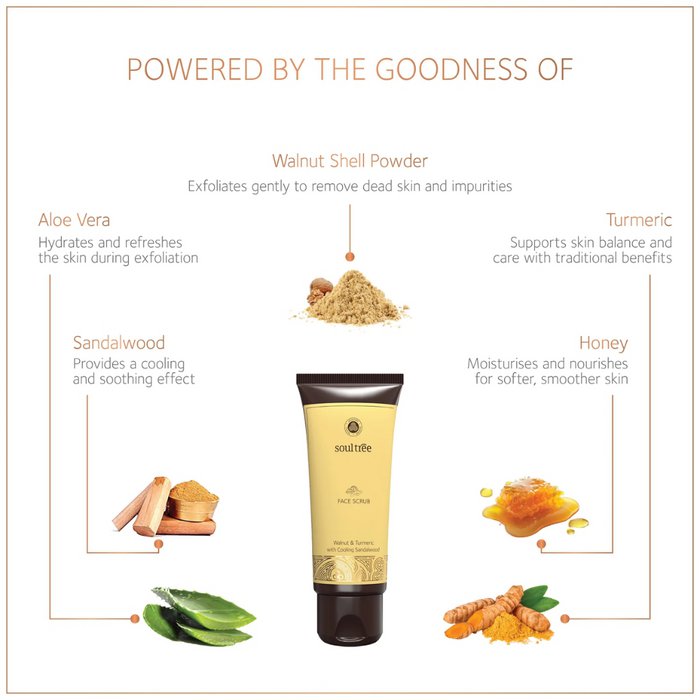 Deze natuurlijke gezichtsscrub van SoulTree exfolieert de huid op zachte wijze en verwijdert dode huidcellen zonder de huid uit te drogen. De ayurvedische formule met walnootkorrels, kurkuma en sandelhout helpt de huid te reinigen, te egaliseren en een frisse uitstraling te geven. Geschikt voor alle huidtypes.