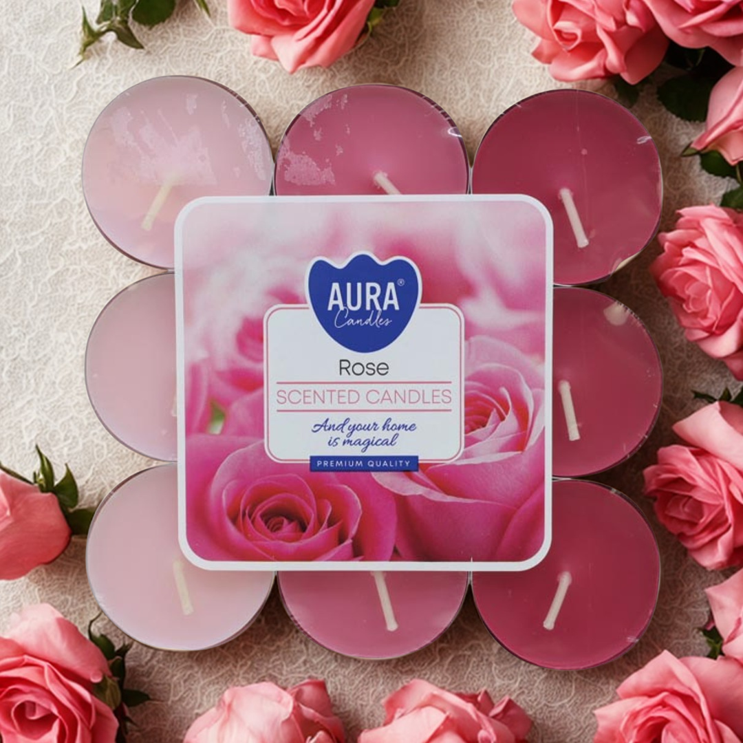 🕯 18 geurtheelichten met rozengeur