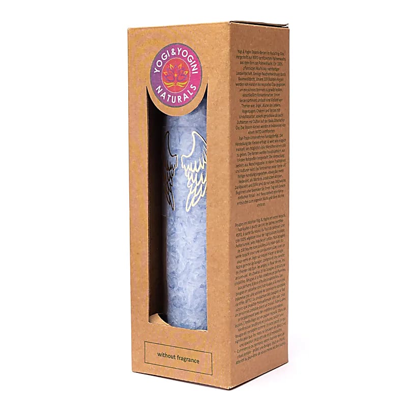 Deze ongeparfumeerde fairtrade kaars is gegoten in gerecycled glas en gemaakt van duurzame stearine (palmpitwas). Het zachte lichtblauw in combinatie met het engelenvleugel-symbool brengt een gevoel van rust, veiligheid en helderheid in elke ruimte. Ideaal voor rituelen, meditatie, herdenking of als dagelijks moment van verstilling.