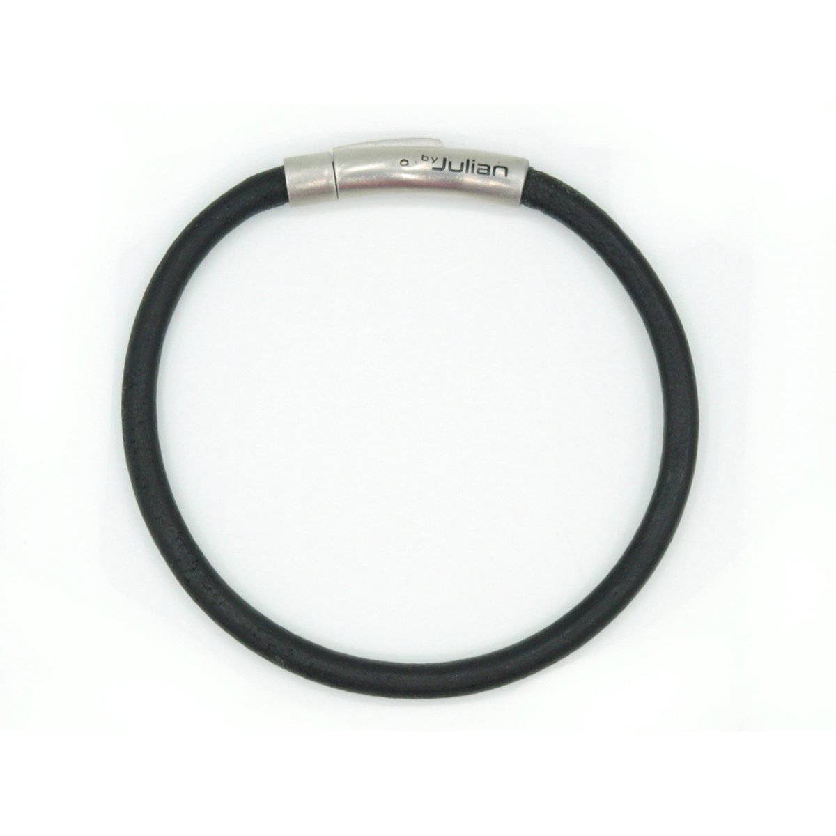 Deze herenarmband is gemaakt van 4 mm leer in de kleur zwart en sluit met een mat zilveren by Julian RVS magneetsluiting.