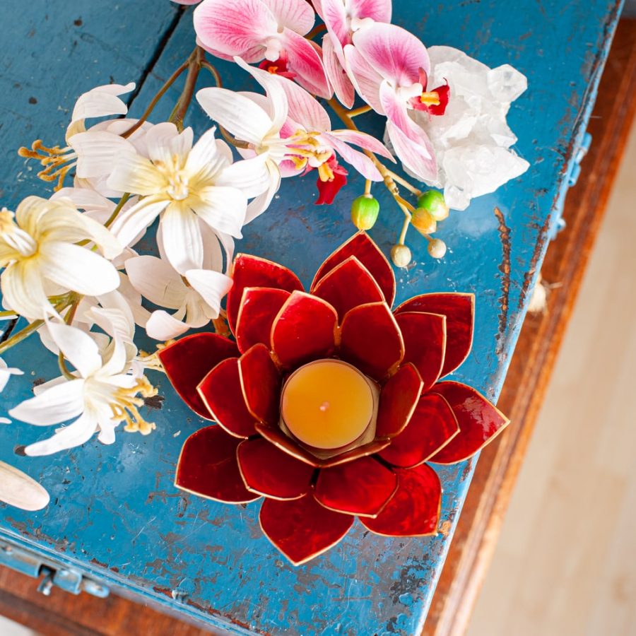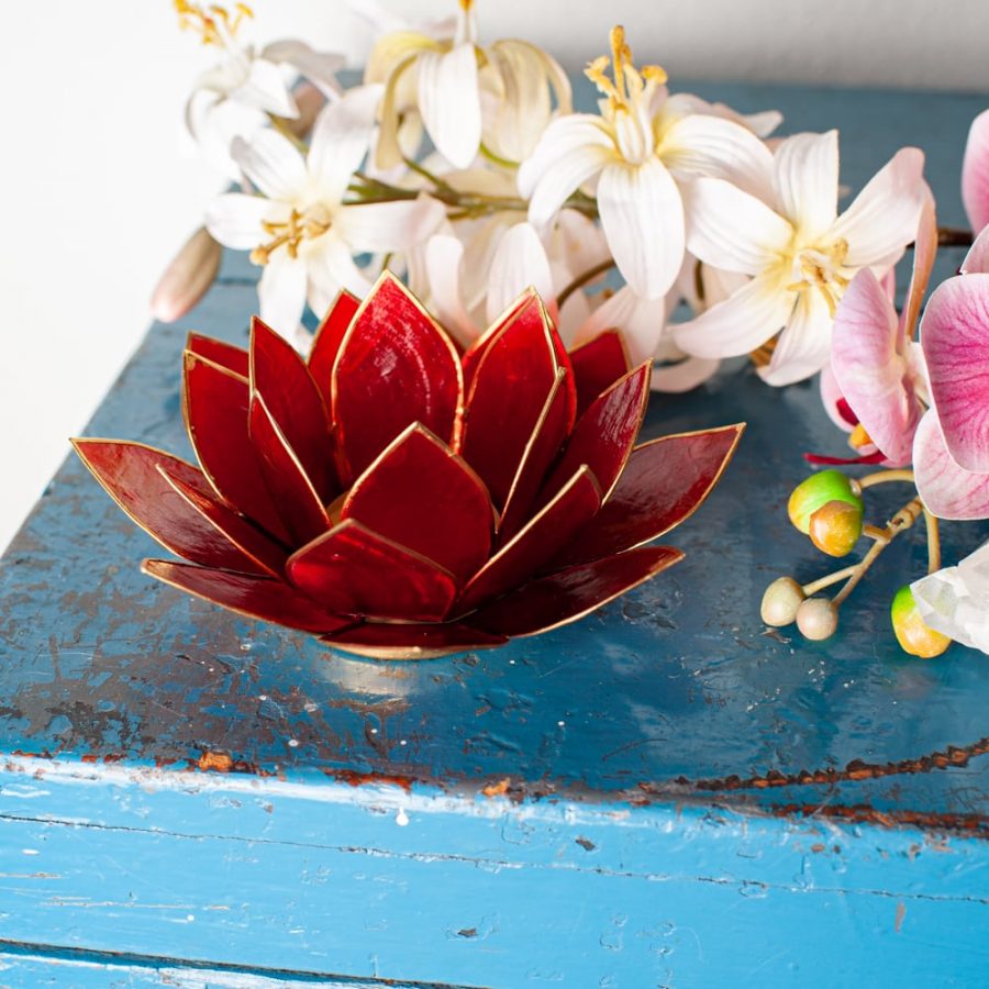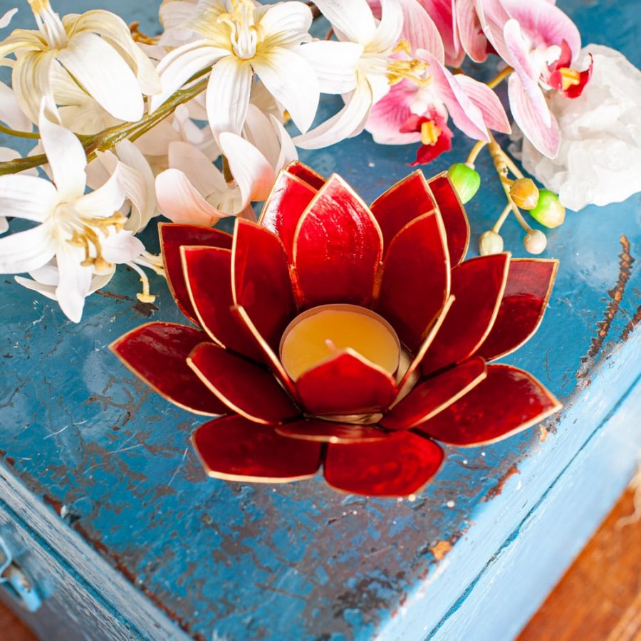 Plaats een theelichtje in het midden van de lotus. Door de lichtdoorlatende capizschelpen ontstaat een warm, intens rood kleurenspel. Ideaal voor meditatie, rituelen gericht op aarding, of als decoratief lichtpunt dat kracht en vertrouwen uitstraalt.
