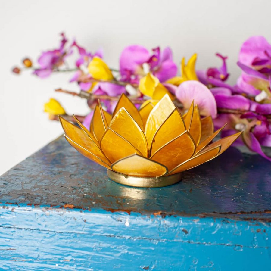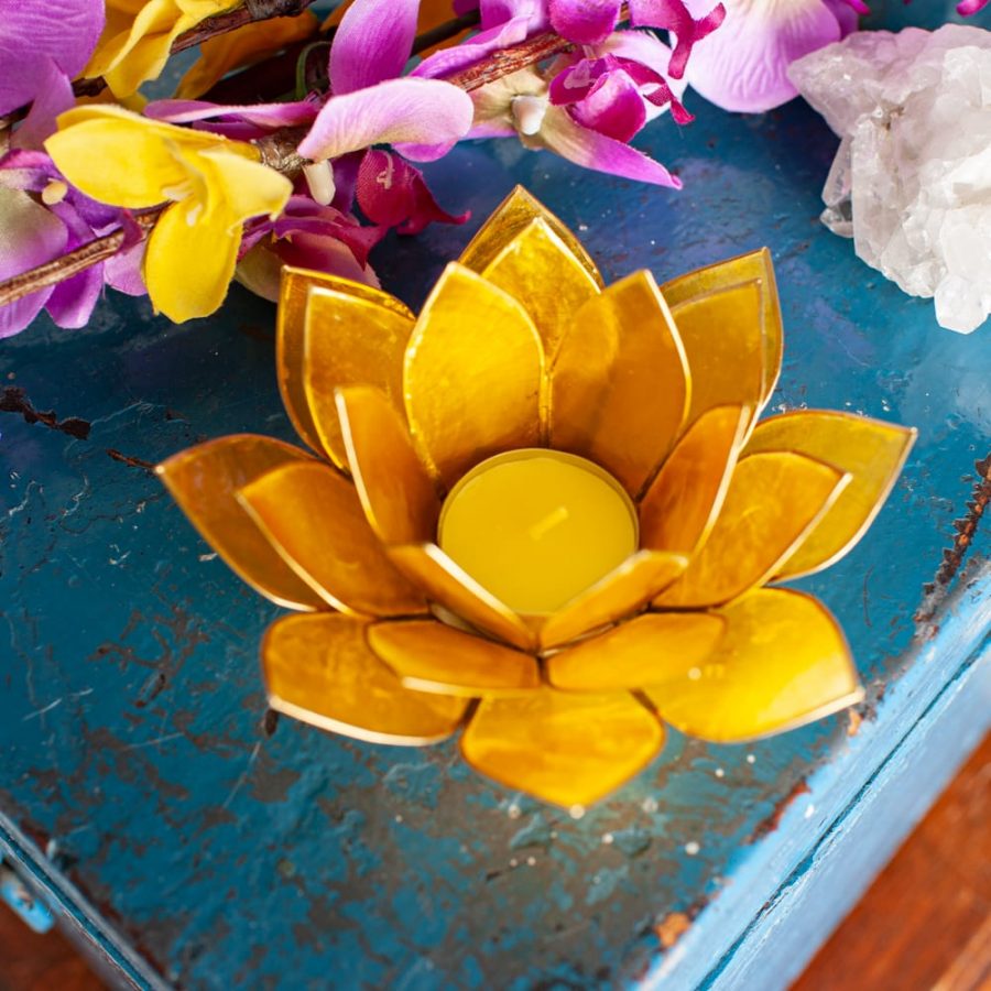 Plaats een theelichtje in het midden van de lotus. De lichtdoorlatende capizschelpen creëren een helder geel licht dat een gevoel van energie en vitaliteit oproept. Ideaal voor werkruimtes, meditatieplekjes of elke plek waar je kracht en focus wilt versterken.