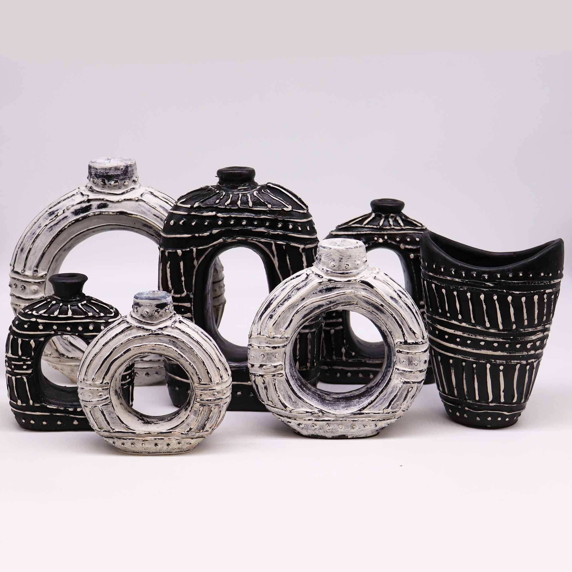De vazen zijn gemaakt van terracotta, een kleisoort, in verschillende vormen en maten. De vazen zijn versierd met verschillende patronen die geïnspireerd zijn op het rijke culturele erfgoed van Indonesië. De ontwerpen variëren van eenvoudige geometrische patronen tot natuurlijke motieven. Geschilderd in neutrale kleuren – wit, crème en zwart.