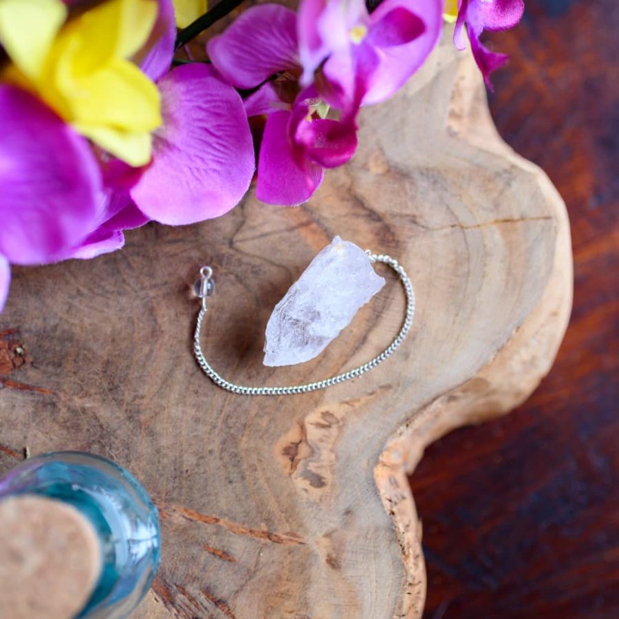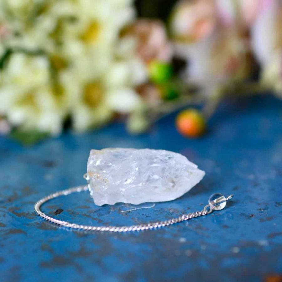 Deze pendel bevat een ruw stuk Bergkristal. Deze is zo veel mogelijk onbewerkt en daardoor natuurlijk. Bergkristal zou een sterk genezende steen zijn die helpt tegen allerlei kwalen. Ook staat deze steen erom bekend dat het de werking van andere stenen versterkt. Kenners geloven dat de steen zuiverend werkt en de aura beschermt tegen straling. Ook zou Bergkristal de chakra’s kunnen reinigen en in balans brengen en de energiestroom kunnen reguleren en vitaliteit geven.