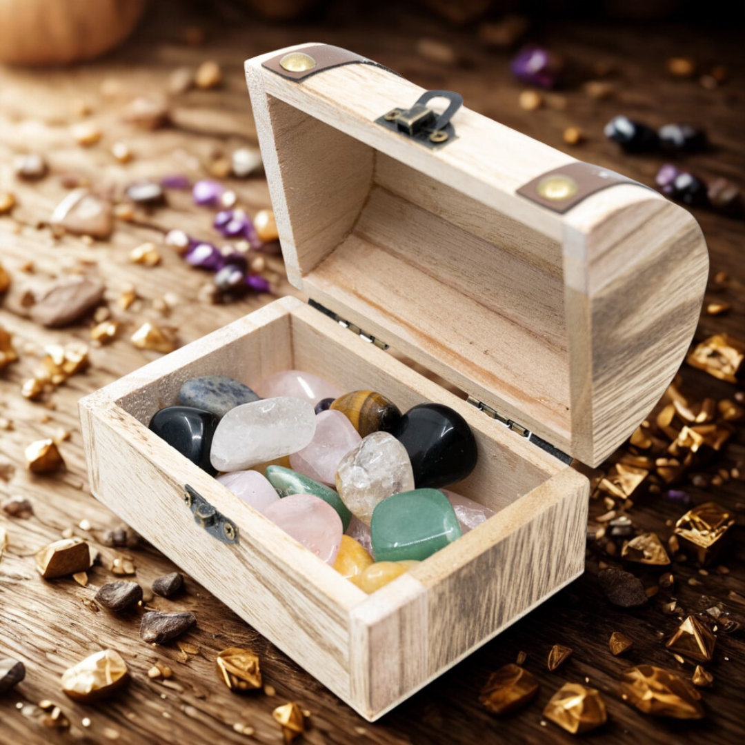 Dit Schatkistje met Edelstenen bevat een speelse mix van trommelstenen in mini-formaat, met een gemiddelde grootte van ca. 10 mm. Elke steen is zorgvuldig gepolijst en geselecteerd om een harmonieuze variatie te bieden in kleur, vorm en energie. De mix verschilt per product, maar kan onder andere bestaan uit rozenkwarts, amethist, tijgeroog, zwarte onyx, bergkristal en aventurijn.