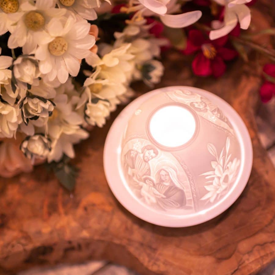 Deze porseleinen oplichtende producten voor waxinelichtjes zijn gemaakt van een speciale, zeer fijne kleisoort. Toegevoegde componenten zorgen voor het oplichtende effect door het bijna transparante aardewerk, dat niet geglazuurd is, maar toch een gladde afwerking heeft. Ervaren kunstenaars hebben magisch vakwerk afgeleverd, met bijzonder reliëfwerking, in prachtige details. Vanuit elke hoek zie je wat anders. Het kijken naar deze sfeermakers is een Zenvolle bezigheid! De porseleinen sfeerlichten zijn zeer breekbaar. Daarnaast zijn ze van nature wit maar zullen ze geel oplichten wanneer er een waxinelichtje in brandt.