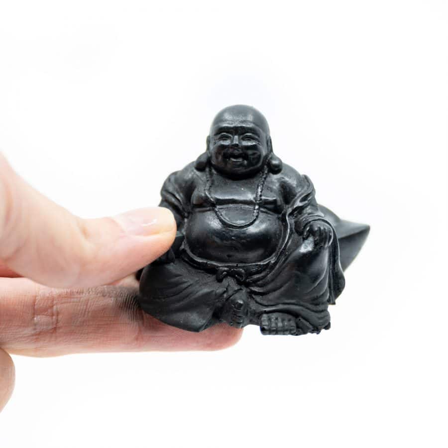 Een Shungiet beeldje in de vorm van een happy Boeddha. Deze beeldjes worden geperst uit Shungiet poeder, daarom zijn ze heel betaalbaar. De beeldjes kunnen afgeven.