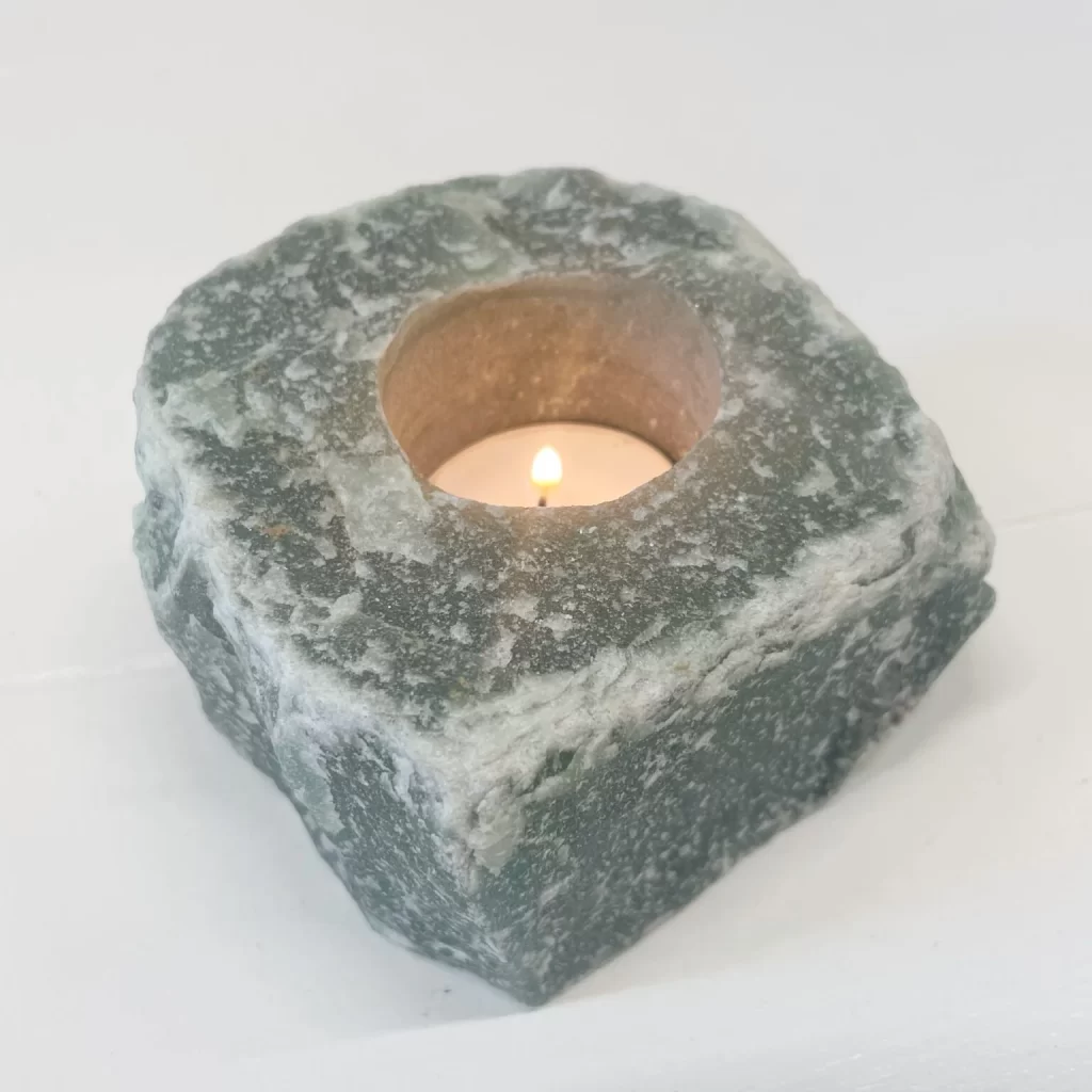 Een lichtpunt van voorspoed en vertrouwen Deze Waxinelichthouder is gemaakt van ruwe aventurijn, de steen van voorspoed en vertrouwen. Het zachte licht van een waxinelichtje laat de natuurlijke groene tinten van de edelsteen stralen en brengt een kalmerende sfeer in huis. • Handgemaakt uit natuurlijk aventurijn• Bekend als edelsteen van voorspoed, vertrouwen en rust• Elk stuk is uniek in kleur, vorm en uitstraling Over het product Aventurijn staat bekend om zijn kalmerende en beschermende energie. De steen bevordert ontspanning, geduld en empathie, en helpt negatieve gevoelens zoals boosheid en irritatie los te laten. Het warme kaarslicht versterkt de rustgevende werking,...