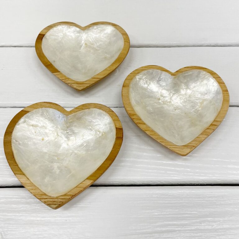 Houten schaaltjes waarvan de binnenkant is ingelegd met capiz schelp. De houten schaaltjes kun je op verschillende manieren gebruiken, leuk om bijvoorbeeld een geurblokje op te leggen. Maar ook als sieraden schaaltje. Elk schaaltje is met de hand gemaakt en uniek. Er zijn er dus géén twee hetzelfde en de maat kan daarom iets afwijken Afmeting: Hart 10 x 10 cm Getoonde prijs is per stuk.