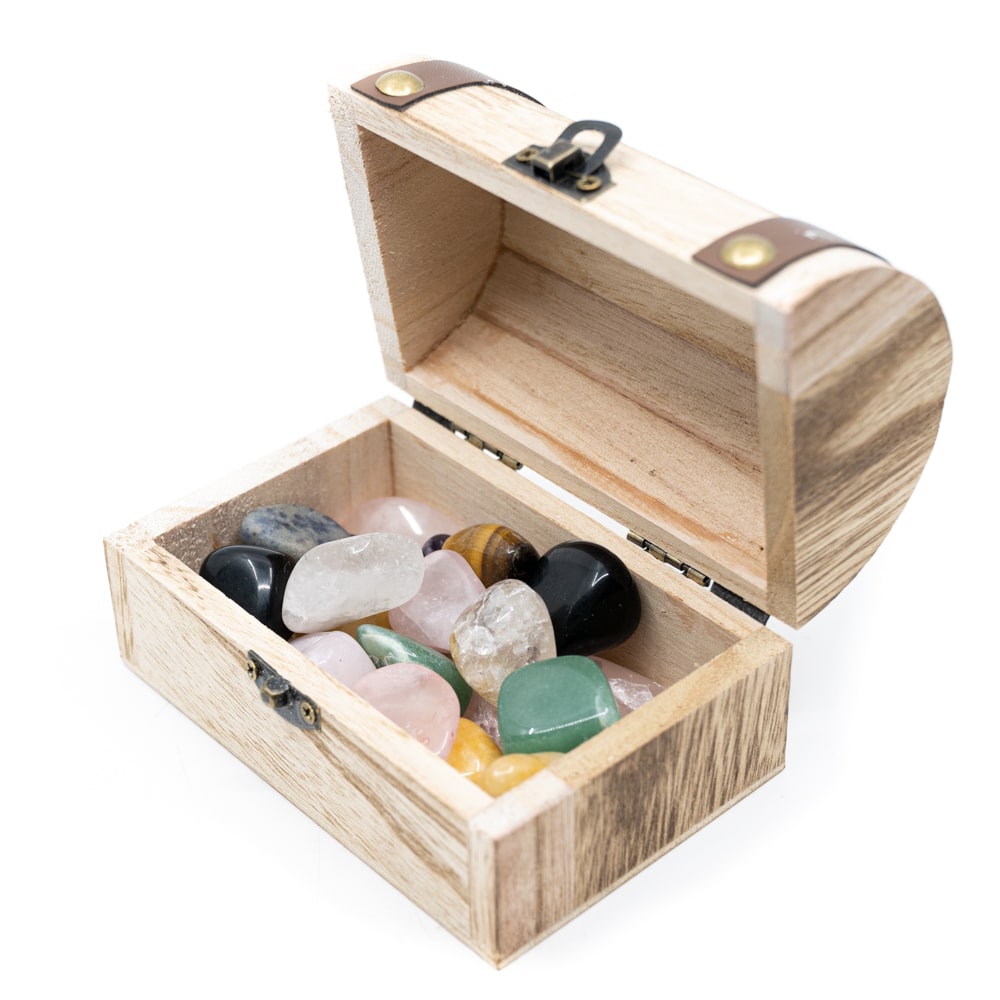 Een magisch kistje vol natuurlijke kracht en kleur Een verrassende mix van edelstenen om te verzamelen, te voelen en te bewonderen. Bevat ca. 200 gram aan edelstenen Elke mix is uniek – met o.a. rozenkwarts, amethist en tijgeroog Ideaal voor beginners en kristalliefhebbers Inclusief mooi houten schatkistje Prachtig cadeau of decoratief object Over het product Dit Schatkistje met Edelstenen bevat een speelse mix van trommelstenen in mini-formaat, met een gemiddelde grootte van ca. 10 mm. Elke steen is zorgvuldig gepolijst en geselecteerd om een harmonieuze variatie te bieden in kleur, vorm en energie. De mix verschilt per product, maar kan...